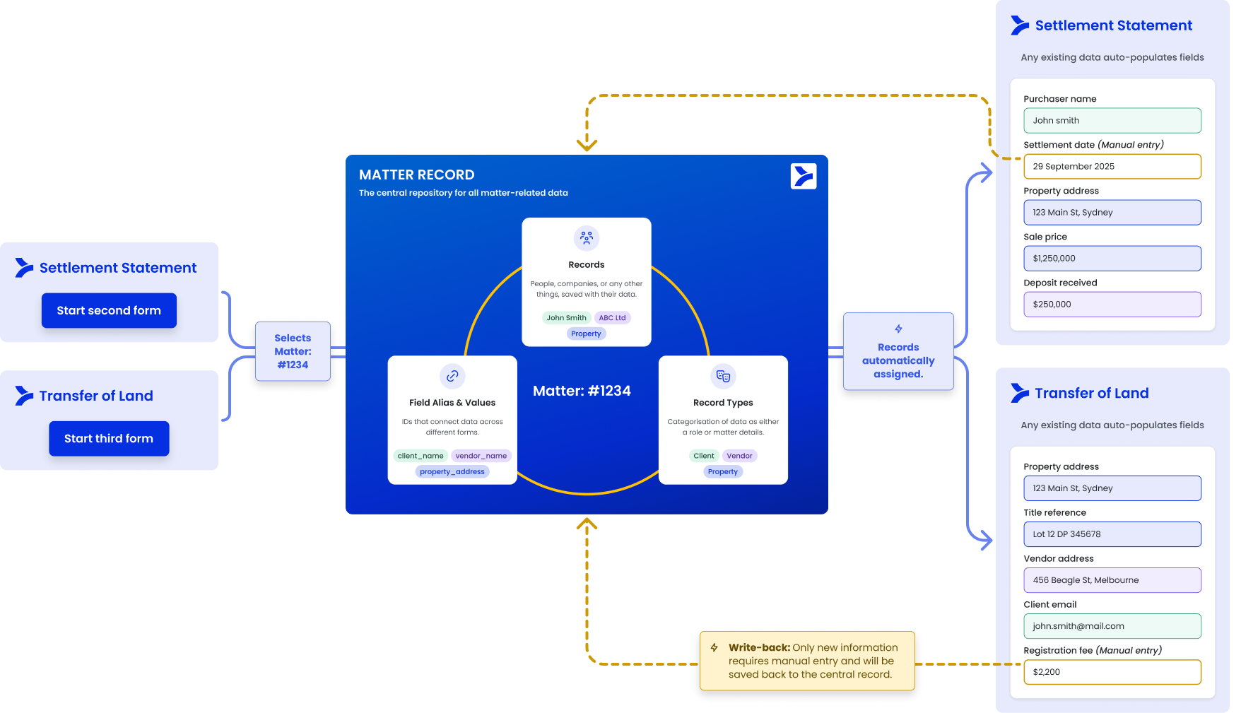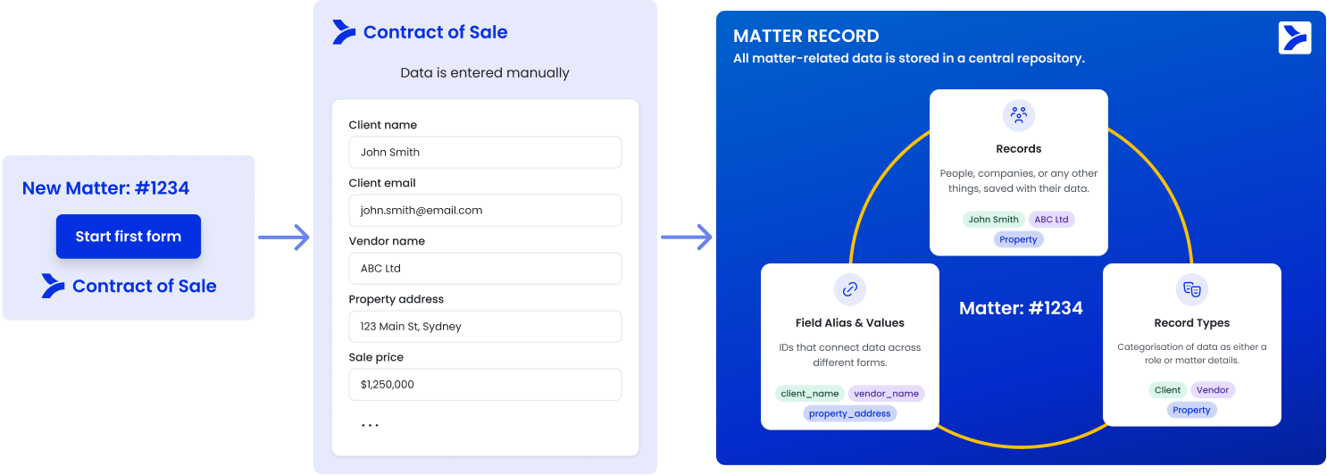 Next time filling in a form for a matter will automatically assign the records created from previous submissions, and auto-populate any of the data relevant for the form.